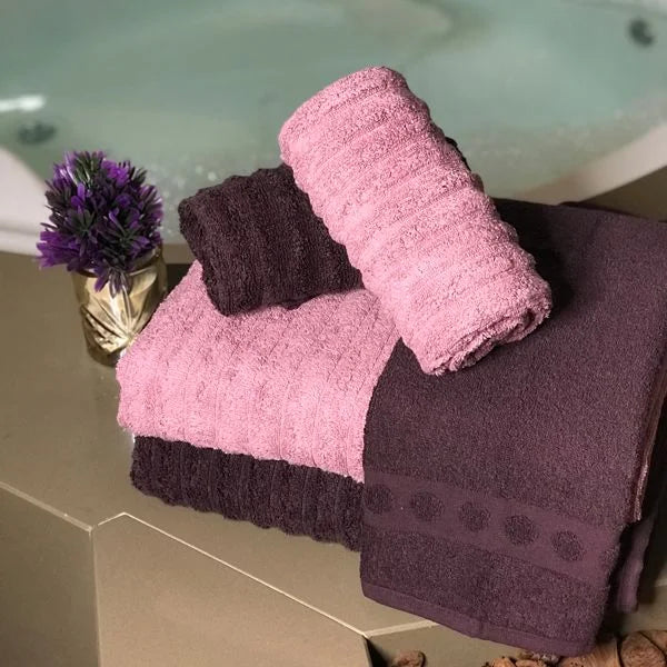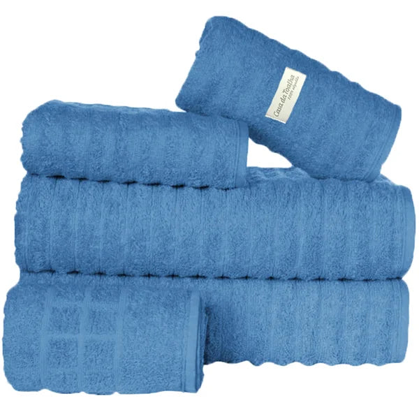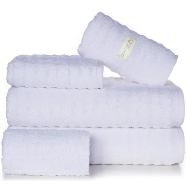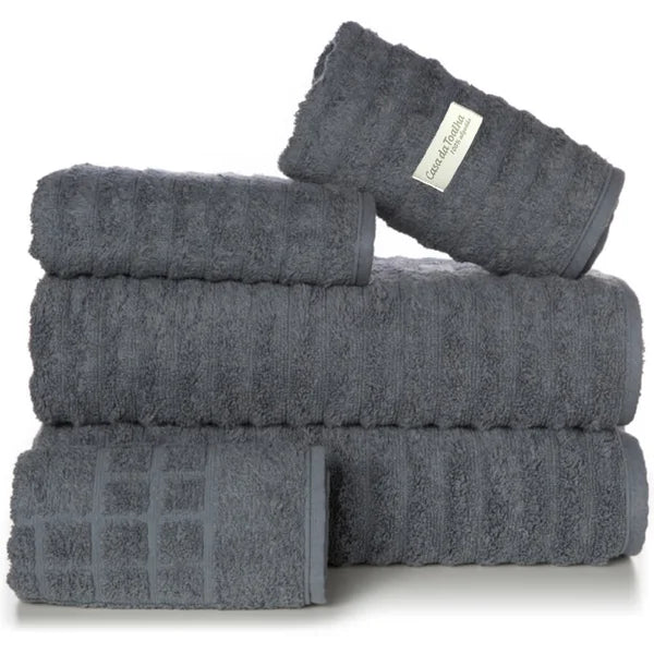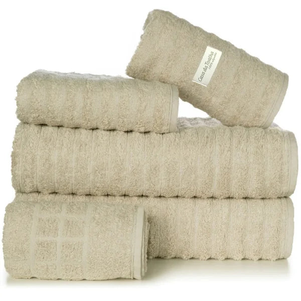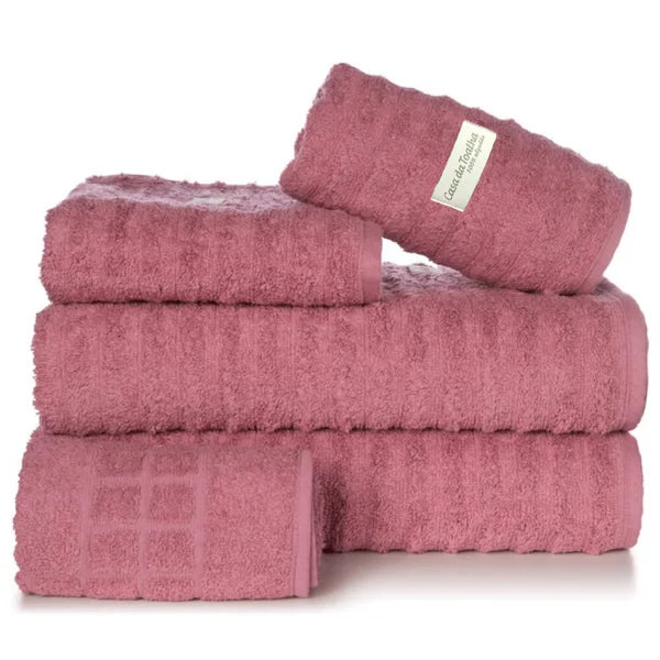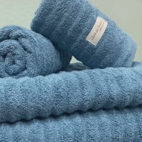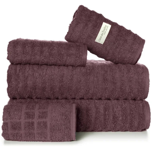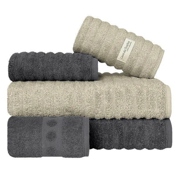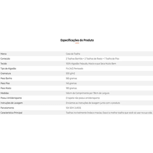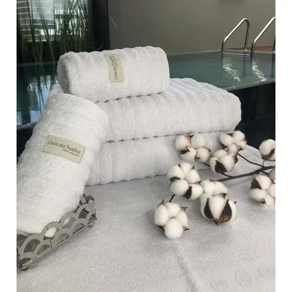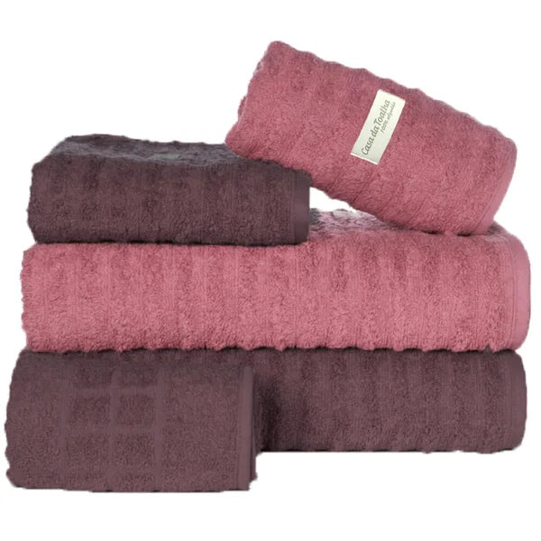 Os jogos de toalhas com 5 peças da Casa da Toalha incluem 2 toalhas banhão, 2 toalhas de rosto e 1 toalha de piso. Todas são em tecido 100% algodão com fio 24/2 duplo penteado e gramatura 500 g/m2. Atualmente esse é o tecido mais macio disponível para toalhas.